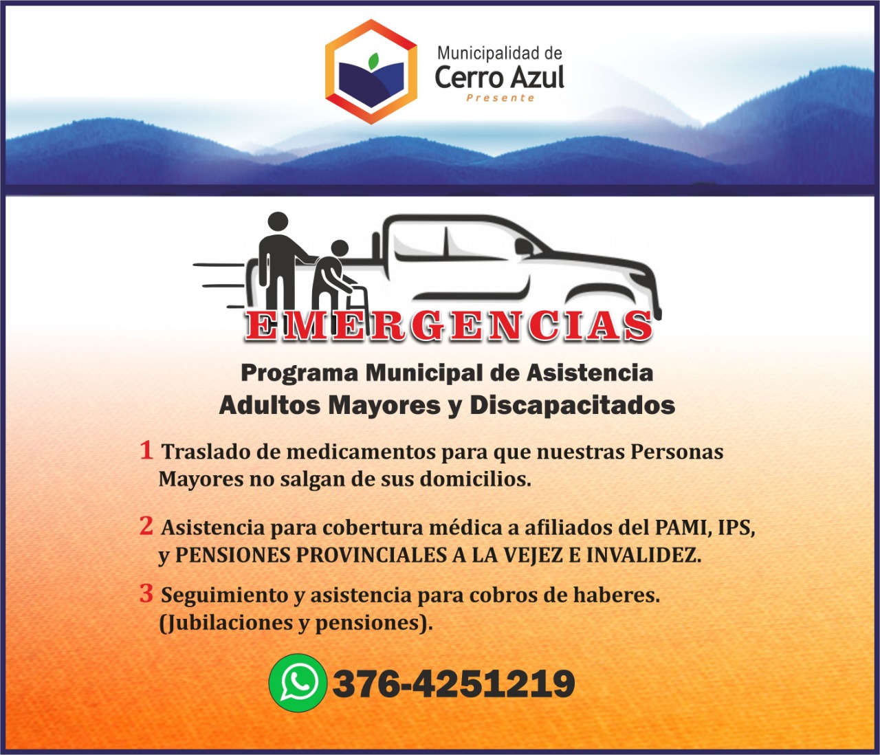 Los adultos mayores que necesiten esa ayuda, y que se encuentren en estado de vulnerabilidad durante esta emergencia sanitaria, podrán comunicarse al número de teléfono celular 3764-251219, y la Municipalidad de Cerro Azul enviará el personal necesario para asistirle.