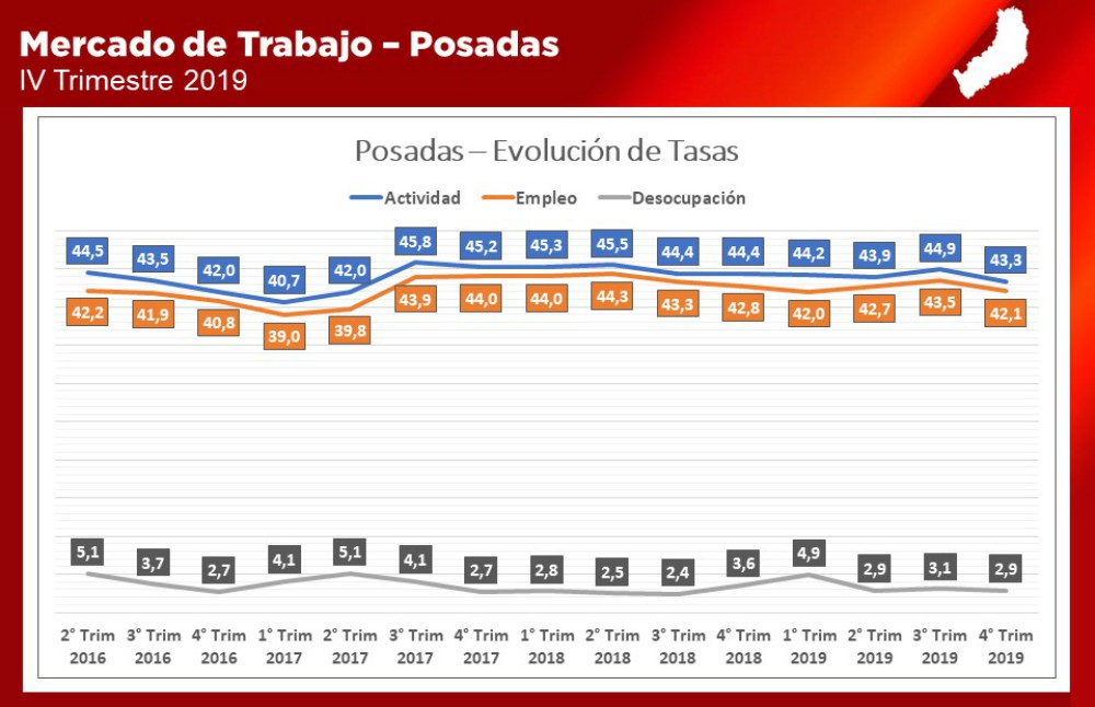 Durante el cuatro trimestre de 2019, el aglomerado misionero tuvo una tasa de empleo del 42,1%, la más alta del NEA. Cabe remarcar que en el tercer trimestre del mismo año el nivel fue de 43,5%, y en el último trimestre del 2018 fue de 42,8%.