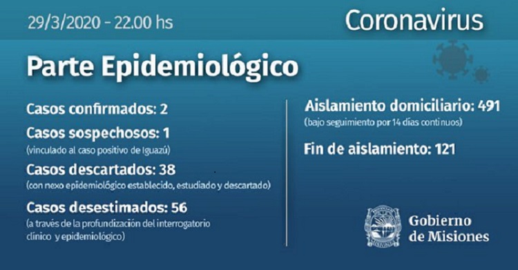 Pasadas las 22 de hoy, el Gobierno de la provincia de Misiones dio a conocer el último parte de salud, en referencia a la actualización de los datos de la tierra colorada, en cuanto a la pandemia de coronavirus con dos casos confirmados (uno en Posadas y otro en Puerto Iguazú), y uno sospechoso (vinculado al caso positivo de Puerto Iguazú).