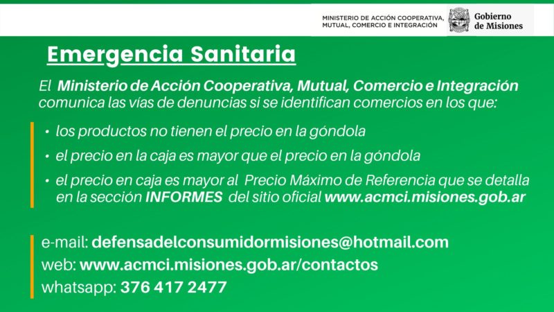 Para realizar denuncias o consultas los consumidores y comerciantes pueden utilizar las siguientes vías que quedaron habilitadas para tal fin: correo electrónico: [email protected]; web: www.acmci.misiones.gob.ar/contacto y a través del WhatsApp: 376 417-2477.