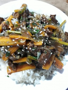 Preparación: en una sartén con un poco de aceite dorar la zanahoria, cebolla, ajo y lentejas. Incorporar el morrón, condimentar con sal y pimienta, dejar cocinar unos minutos, incorporar el caldo. En un bowl colocar 1/2 taza de salsa de soja y la fécula, disolver e incorporar a los vegetales, cocinás unos minutos e incorporar la cebolla de verdeo y el perejil picados, servir con arroz blanco y espolvorear con las semillas.