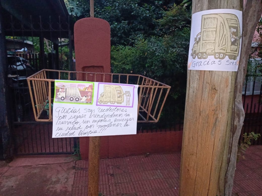 En este caso, vecinos de la calle Mitre de Oberá decidieron reconocer el trabajo de los recolectores de su ciudad y le dejaron un cartel de agradecimiento y una bolsa con galletitas y gaseosas para que compartan. Un mimo en tiempos de pandemia con los que deben trabajar.