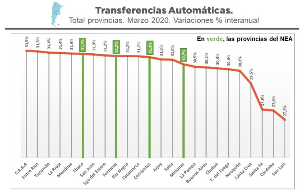Para ello se tuvo en cuenta que en marzo, Misiones recibió en concepto de coparticipación y leyes especiales el total de $4.036,9 millones (+30,9% interanual); mientras que en concepto de Compensación del Consenso Fiscal (Punto II.a, Ley 27.429), a la provincia ingresaron otros $192,6 millones (+25%,9 interanual).