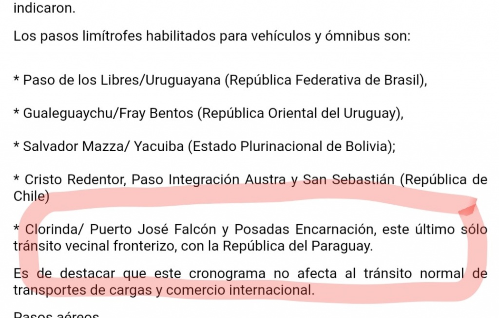 A pesar del reclamo, al borde del mediodía de este miércoles, el Ministerio del Interior envió un comunicado donde seguía ubicando el paso de Posadas para ser habilitado como Tráfico Vecinal Fronterizo (TVF).
