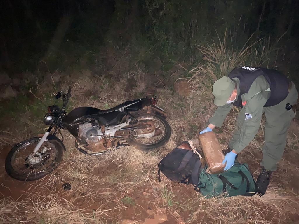 En una motocicleta Honda Titán 150 intentó darse a la fuga de la patrulla perteneciente al Escuadrón 11 “San Ignacio” de la fuerza federal. En dos mochilas transportaba dos ladrillos de cogollos de marihuana envueltos en film plástico y grasa, 17,473 kilogramos en total.
