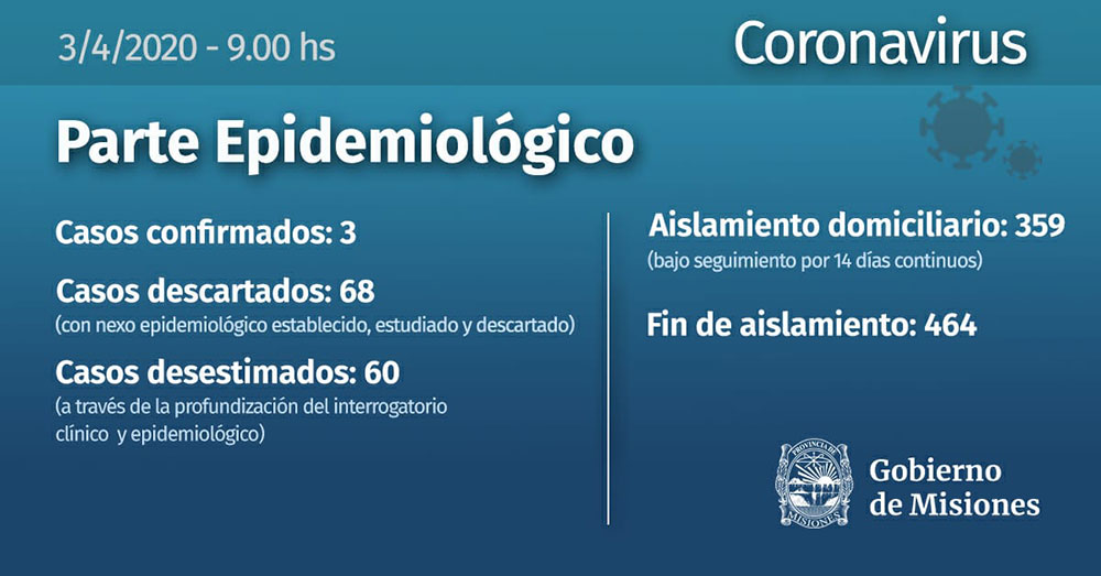 En Misiones en tanto, según el parte epidemiológico de esta mañana informa que continúa con sólo tres casos positivos y ningún sospechoso. Además siguen en aislamiento preventivo bajo monitoreo constante 359 personas, se descartaron 68 casos con nexo epidemiológico establecido, se desestimaron 60 casos y ya finalizaron el aislamiento 464 personas.