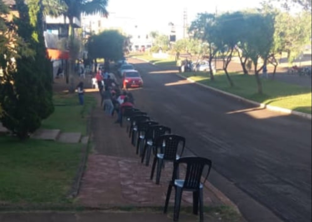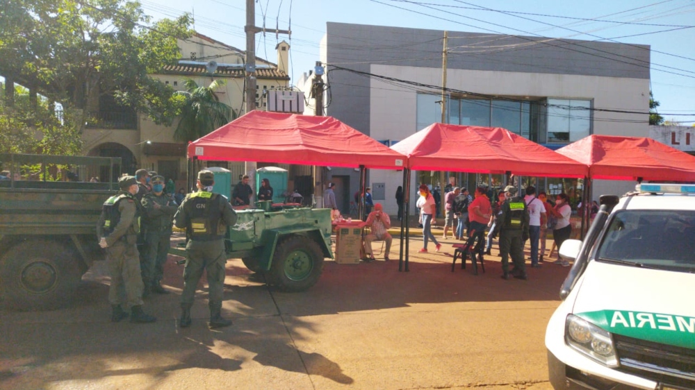 En Eldorado pintaron los espacios de espera y distancia, se colocaron sillas e incluso, entre la Municipalidad y Gendarmería Nacional colocaron carpas de atención a los adultos mayores en caso de necesitarlo y también ofreciendo chocolatada.