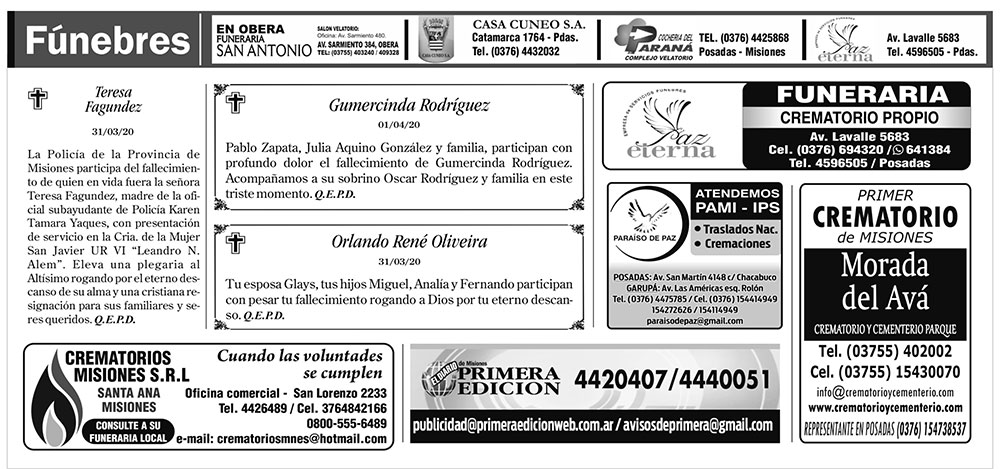 Fúnebres del jueves 2 de abril de 2020