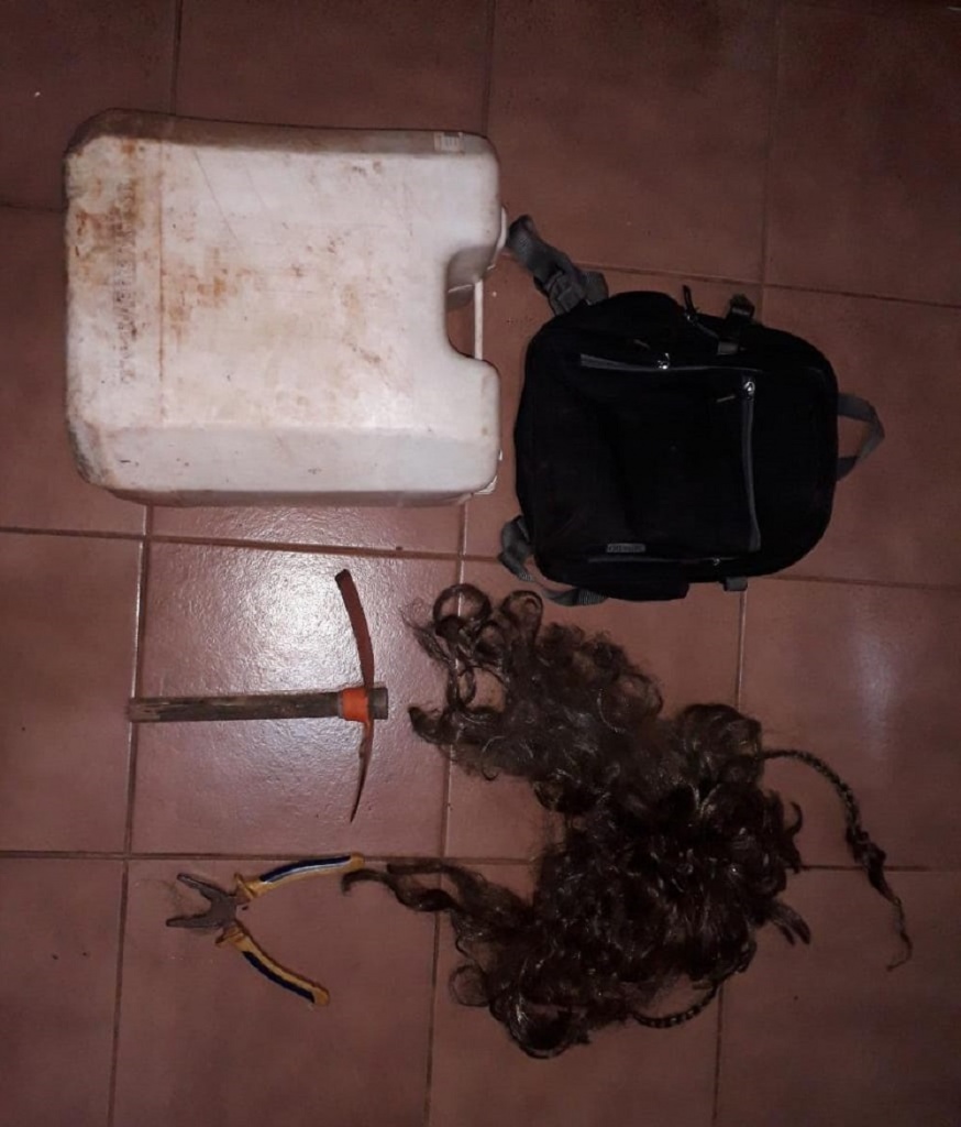 En el despliegue policial se incautó un bidón de 20 litros, una mochila, una pinza, una pala de jardín y la peluca de cabello sintético de color marrón.