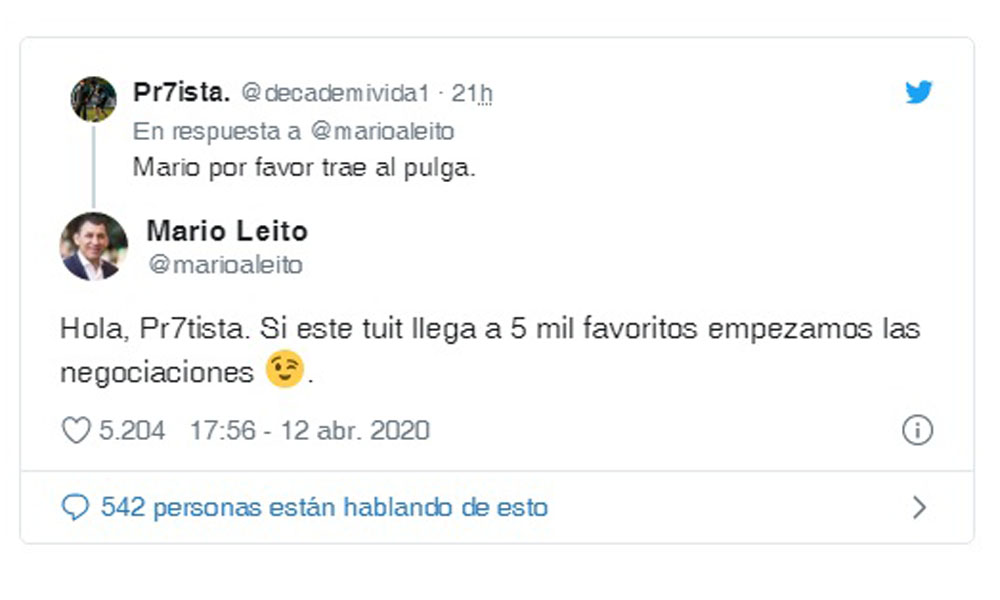 ¿Cómo arrancó todo? Ayer domingo, el presidente de Atlético, Mario Leito, escribió en la red social un saludo por Pascua. Una respuesta entre tantas llamó la atención. “Mario por favor traé al pulga”, escribió Pr7ista. Y el presidente redobló la apuesta: “Hola Pr7ista. Si este tuit llega a 5 mil favoritos empezamos las negociaciones”, escribió Leito.