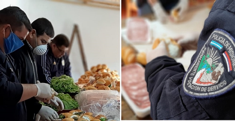 Efectivos de la Unidad Regional 6 de la Policia de Misiones elaboraron hoy más de 6.500 sándwiches, con el fin de asistir e interiorizarse en como se encuentran en este tiempo de cuarentena obligatoria los vecinos de zonas más humildes de la ciudad de Leandro N. Alem.