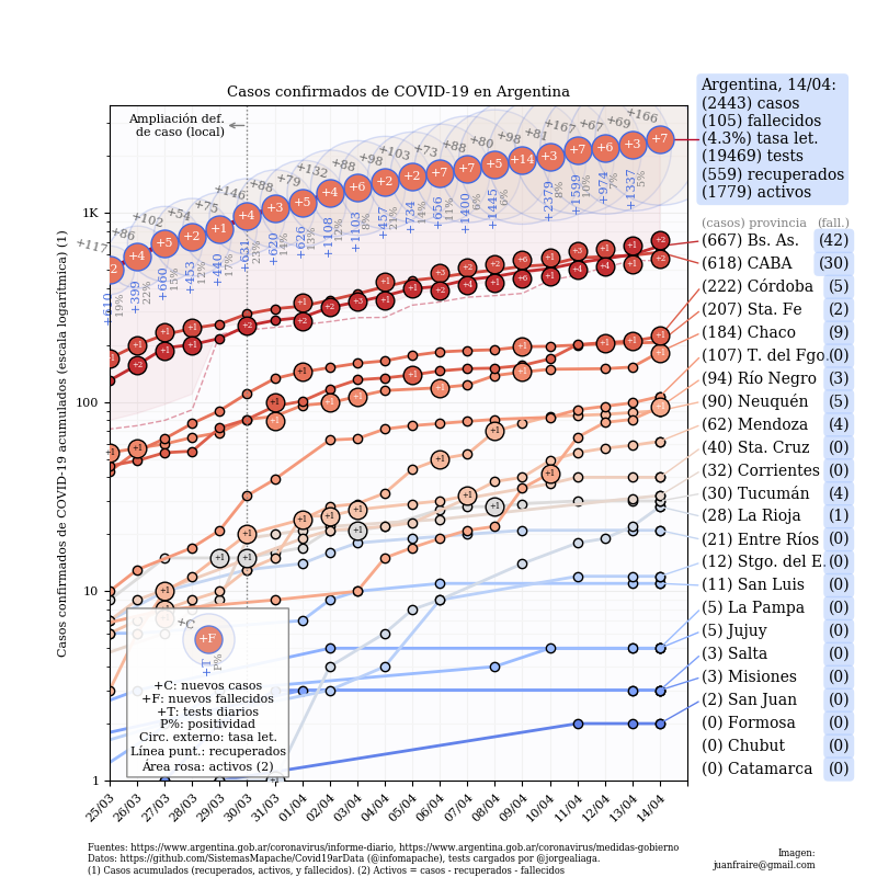 Este martes, siete personas fallecieron en las últimas horas, mientras que 166 nuevos casos de pacientes con coronavirus (COVID-19) se confirmaron en el país. La cifra total de infectados con el virus asciende a 2.443 y las víctimas fatales hasta el momento son 105, según informó el Ministerio de Salud de la Nación.
