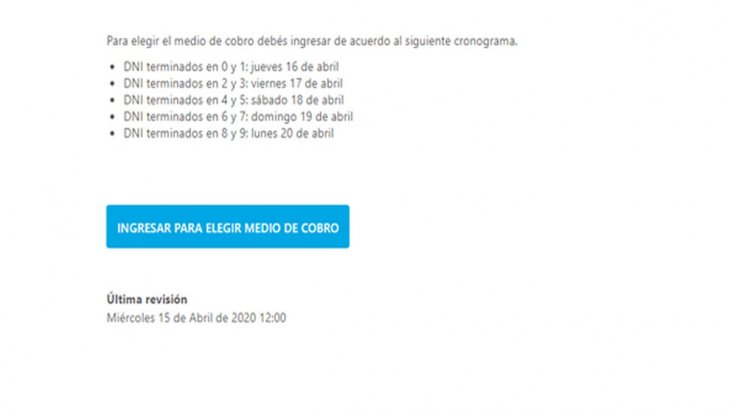 Con el siguiente Cronograma, desde las 0 hora del jueves 16 y hasta el lunes 20 inclusive, los beneficiarios del Ingreso Familiar de Emergencia (IFE) que no estén bancarizados y por ende no tenga CBU, y que no han elegido un medio de cobro, desde la WEB de Anses, deberán hacer el trámite para recibir los $10.000 y a su vez, elegir las modalidades de cobro.