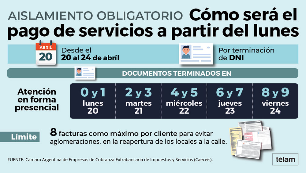 La Caeceis también adelantó que habrá un límite de facturas aceptadas por lo que cada cliente podrá abonar un máximo de 8 servicios o impuestos, en tanto que los adultos mayores y las personas pertenecientes a grupos de riesgo tendrán atención prioritaria y, en la medida de disponibilidad de cada local, se habilitarán horarios especiales para ellos.