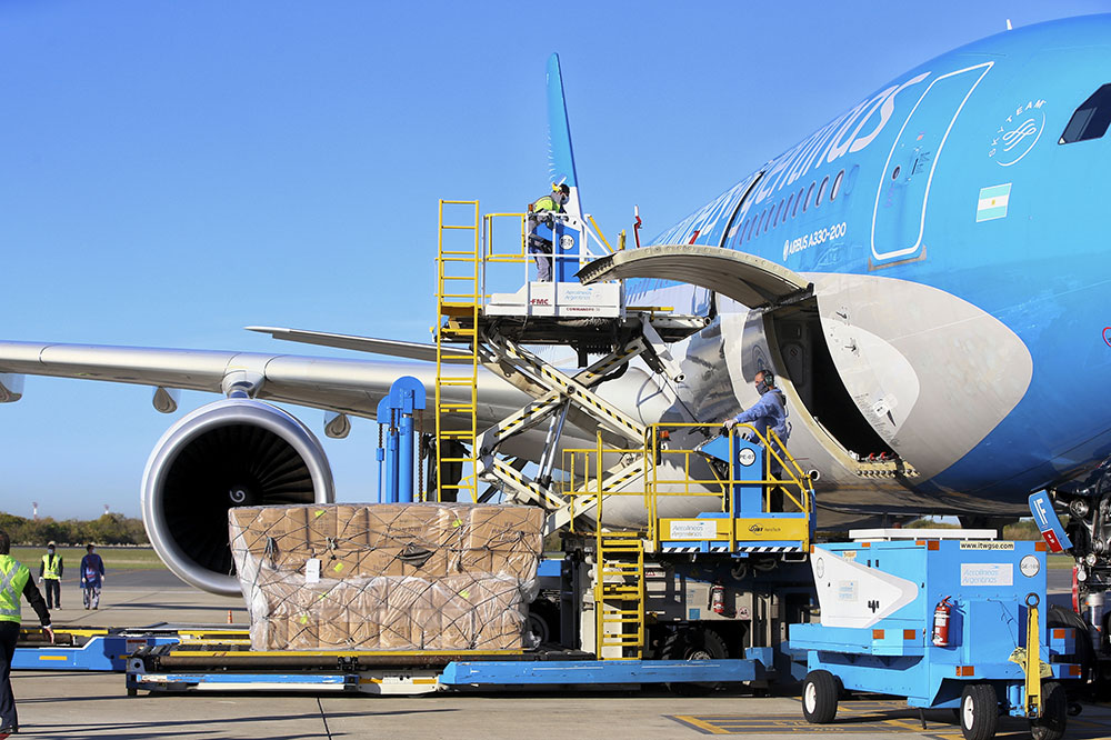 El primer vuelo de Aerolíneas Argentinas procedente de Shanghái, República Popular China, con 14 toneladas de insumos críticos sanitarios requeridos por el gobierno de la provincia de Buenos Aires, llegó este sábado a las 7.45 al aeropuerto Internacional de Ezeiza, en una operación sin precedentes en la historia de la línea de bandera.