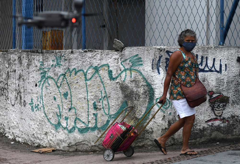 Una mujer con máscara protectora camina por las calles de Río de Janeiro, Brasil