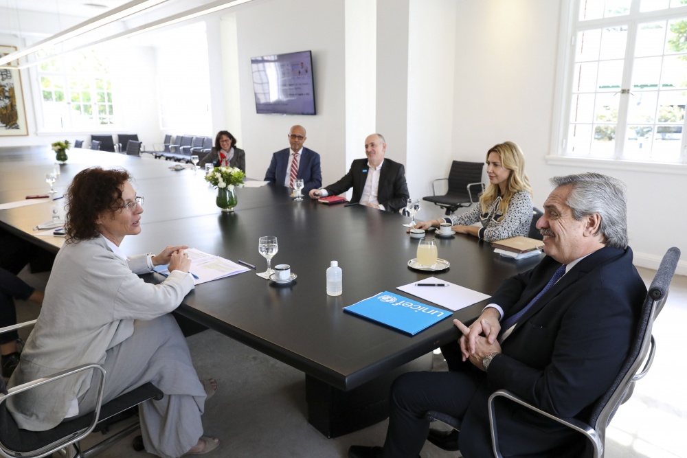 De la reunión con Fernández esta tarde también participaron la representante adjunta de Unicef, Olga Izasa; la representante de las Naciones Unidas en Argentina, Roberto Gabriele Valent, y el especialista en inclusión social de Unicef, Sebastián Waisgrais.
