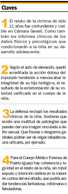 La investigación se inició con la denuncia de la progenitora ante la Comisaría de la Mujer de Puerto Iguazú y el fiscal de Instrucción 3 Horacio Ariel Paniagua, tras el pedido de opinión del juez Martín Brites, requirió la elevación a plenario de la causa, con el encartado a responder por los delitos de “abuso sexual con acceso carnal doblemente agravado por el vínculo y por el uso de arma varios hechos en concurso real (artículo 119, tercer y cuarto párrafo, incisos B y D in fine en función del artículo 55 del Código Penal Argentino) y en concurso ideal con corrupción de menores agravado (artículo 125 párrafo 2 y 3 del mismo compendio normativo)”.