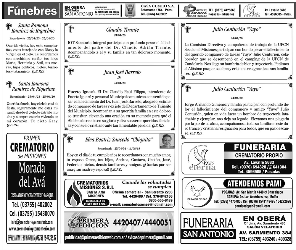 Fúnebres del sábado 25 de abril de 2020