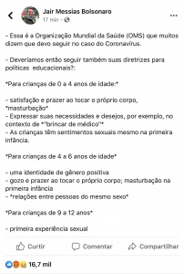 Arthur Weintraub, un asesor de Bolsonaro, había tuiteado antes que “la OMS tiene directrices recomendando que se enseñe a los niños de 0 a 4 años ‘masturbación’, ‘placer y diversión’, ‘tocar el propio cuerpo’ e ‘ideología y género’. ¿Es eso correcto?”
