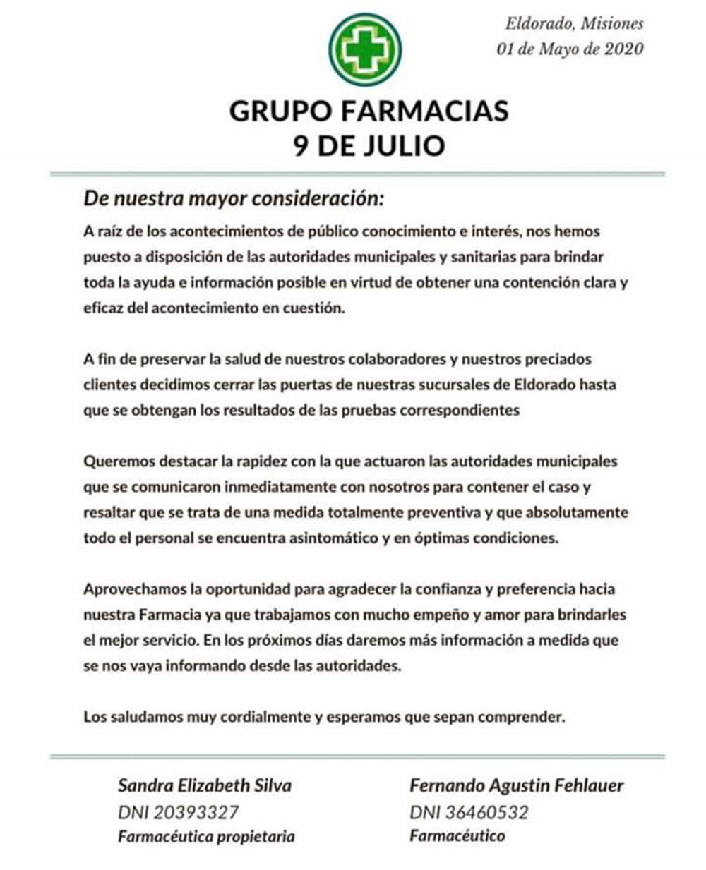 A través de un comunicado, la dueña de la farmacia anunció este viernes que el grupo de farmacias “9 de Julio” de Eldorado, se mantendrá cerrado como medida de prevención por posible contacto indirecto de sus empleados con el bebé de 45 días con COVID-19.