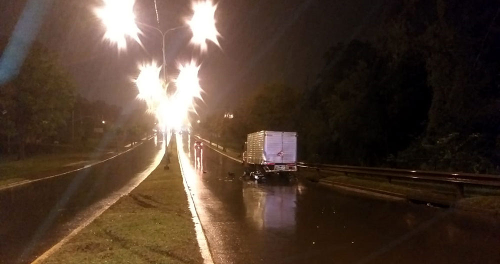 Ocurrió anoche en la autovía de acceso a Oberá, en momentos de fuertes precipitaciones, cuando por razones que se tratan de establecer, una motocicleta de 110 centímetros cúbicos, que era guiada por Esteban Esperanza Leyes de 50 años, acompañado por su hijo César de 30; impactó en la parte posterior de un camión Mercedes Benz, que se hallaba estacionado en dicha autovía, por desperfectos mecánicos, el cual contaba con las señalizaciones.