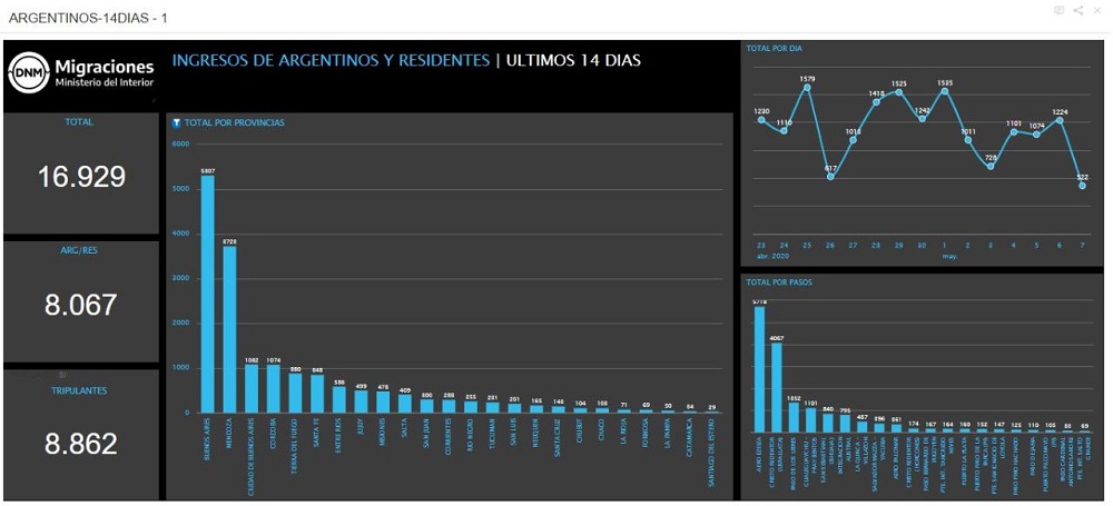 En el caso de los ingresos, las autoridades provinciales pueden visualizar la cantidad, la fecha y el país de procedencia -y países de tránsito de los últimos 14 días- de argentinos nativos y residentes.