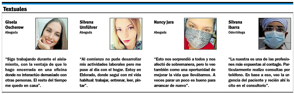 Desde el primer momento, la abogada Nancy Jara acató la orden de aislamiento. “Empecé a trabajar desde casa y a adelantar todo lo que podía a la espera de que se levante el aislamiento y poder presentar los escritos. Y como vivo a cuatro cuadras del estudio, me resulta menos complicado moverme, siempre con los recaudos necesarios: tapabocas y alcohol en gel, evitando el contacto”.