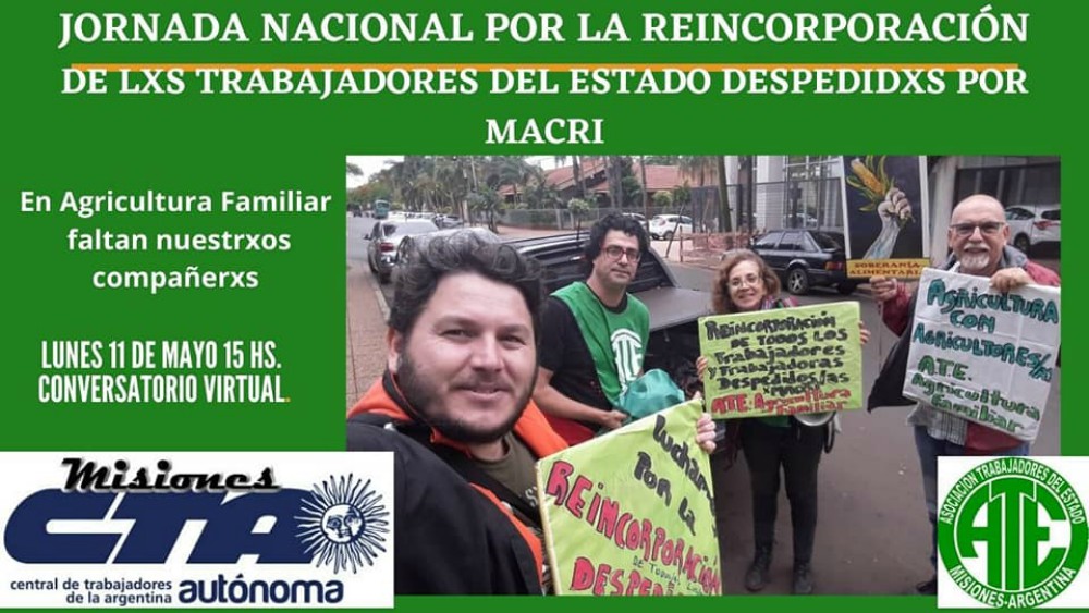 Desde ATE en su sede provincial, junto a la CTA Autónoma Misiones, continúan reclamando para lograr “la reincorporación urgente de todos los trabajadores despedidos durante el macrismo”, en relación al personal afectado de la secretaría de Agricultura Familiar. Es por ello que este lunes realizarán un conversatorio virtual para evaluar la compleja situación, dentro de una jornada nacional.