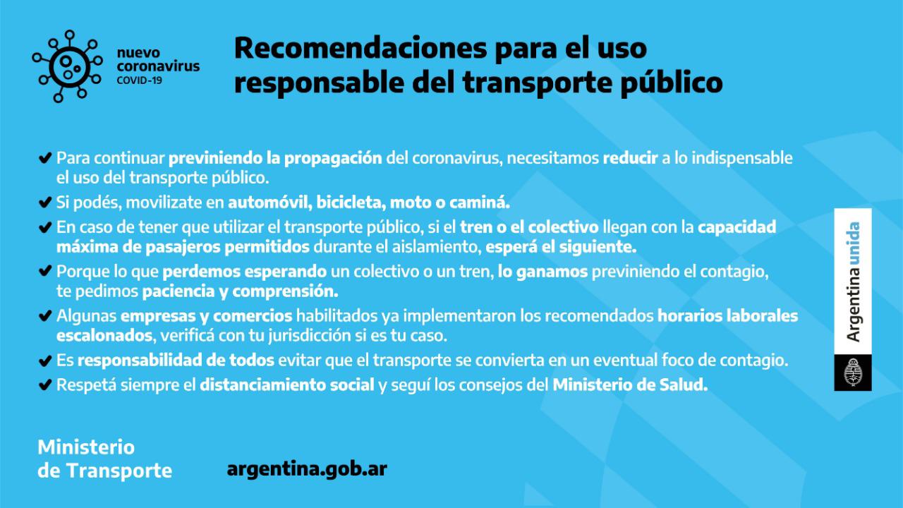 Por otra parte, tras el anuncio de la nueva extensión del aislamiento social, preventivo y obligatorio, y la habilitación de nuevos comercios exceptuados, desde el Ministerio de Transporte de la Nación se recomienda profundizar las conductas necesarias para evitar que el transporte público se convierta en un eventual foco de contagio.