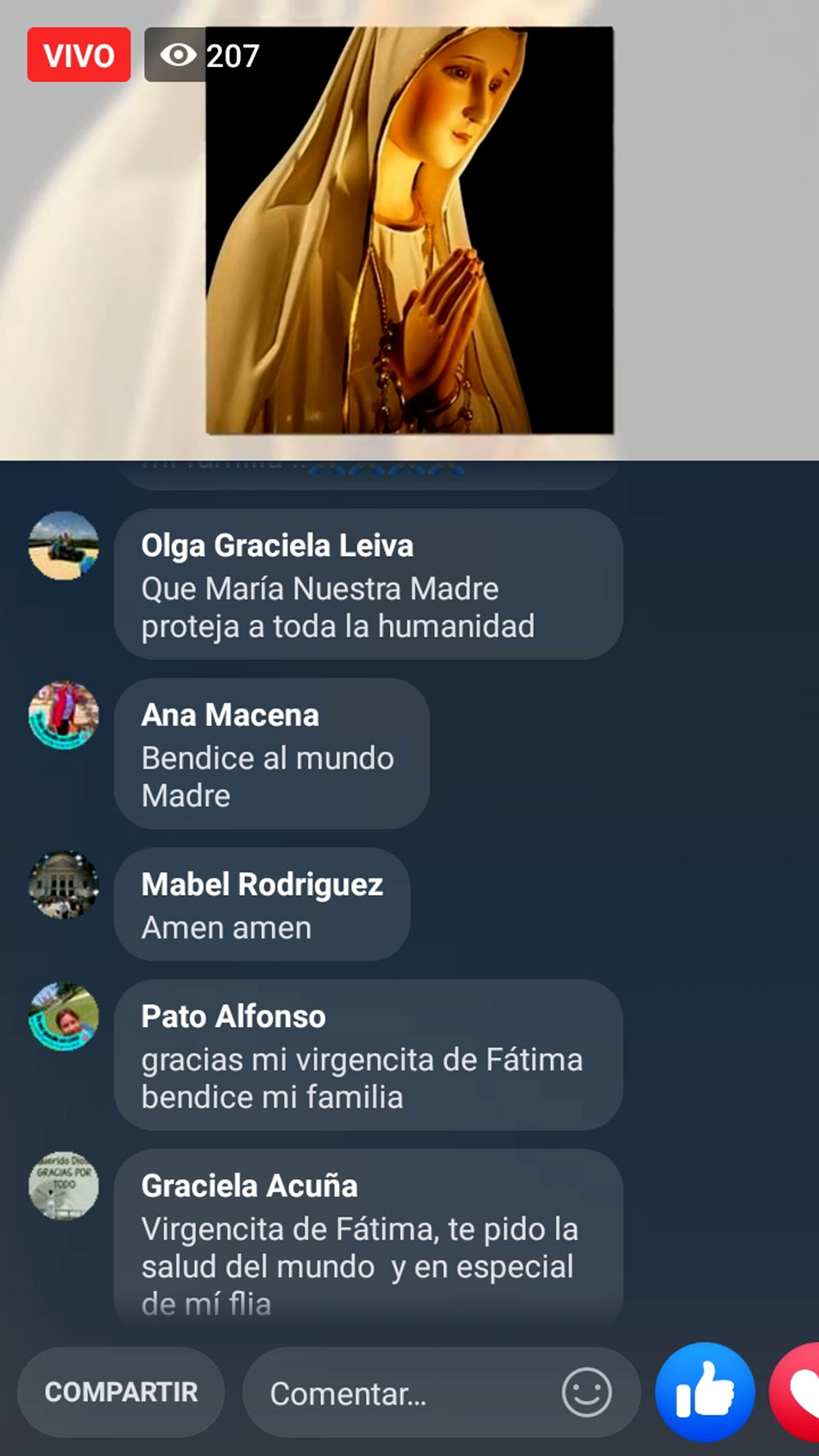Por su parte, Celia Ferrari pidió “paz por mi país, que no falte alimento en ningún hogar de mi amado país”. Mientras que Norma Ester Saldaña expresó: “Estoy compartiendo con ustedes esta trasmisión y especialmente orando y cantando a la virgencita”.