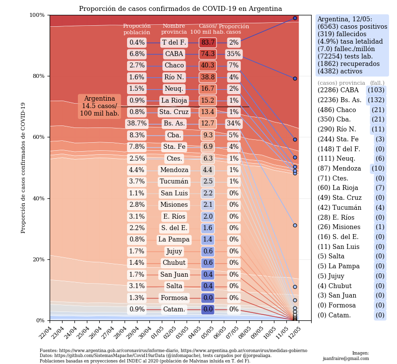 Además, se incluyen 13 casos en Tierra del Fuego existentes en las Islas Malvinas, según información de prensa debido a que por la ocupación ilegal del Reino Unido, Gran Bretaña e Irlanda del Norte no es posible contar con información propia sobre el impacto del Covid-19 en esa parte del territorio argentino.