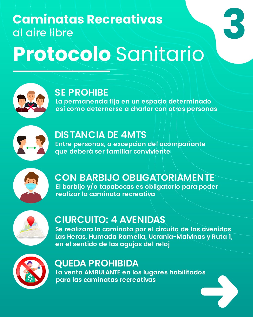 9) Se establece que la caminata recreativa se realizará por las Avdas. Las Heras, Humada Ramella, Ucrania-Malvinas y Polonia (Las 4 Avenidas), utilizando como sentido de circulación las agujas del reloj. En caso de que por alguna razón deba modificarse el recorrido y/o sentido de circulación, el mismo deberá ser realizado por lugares distintos al que se utilicen como vía principal para la actividad (ejemplo: veredas) y de tal manera que ésta circunstancia no implique superposición en el recorrido de los demás caminantes, evitando cruzarse de frente en todo momento.