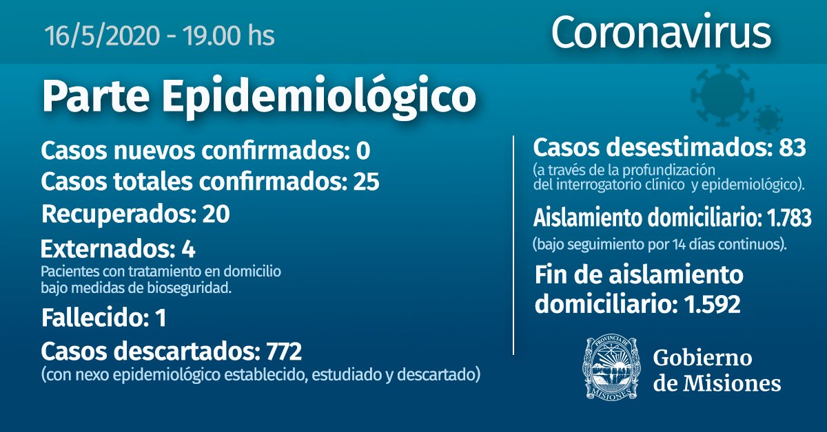 El Gobierno de Misiones en tanto en el único parte que emite por día, dio cuenta que la provincia solamente cuenta con cuatro pacientes que aún permanecen con tratamiento domiciliario bajo estrictas medidas de bioseguridad