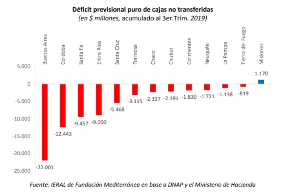 Así, en el acumulado al tercer trimestre de 2019 (últimos datos oficiales) el desequilibrio resultaría de $22.001 millones en el caso de provincia de Buenos Aires, $12.443 millones en Córdoba, $9.457 millones en Santa Fe, $9.000 millones en Entre Ríos, hasta $819 millones en Tierra del Fuego. En cambio, Misiones presentaría un leve superávit previsional de $1.170 millones.