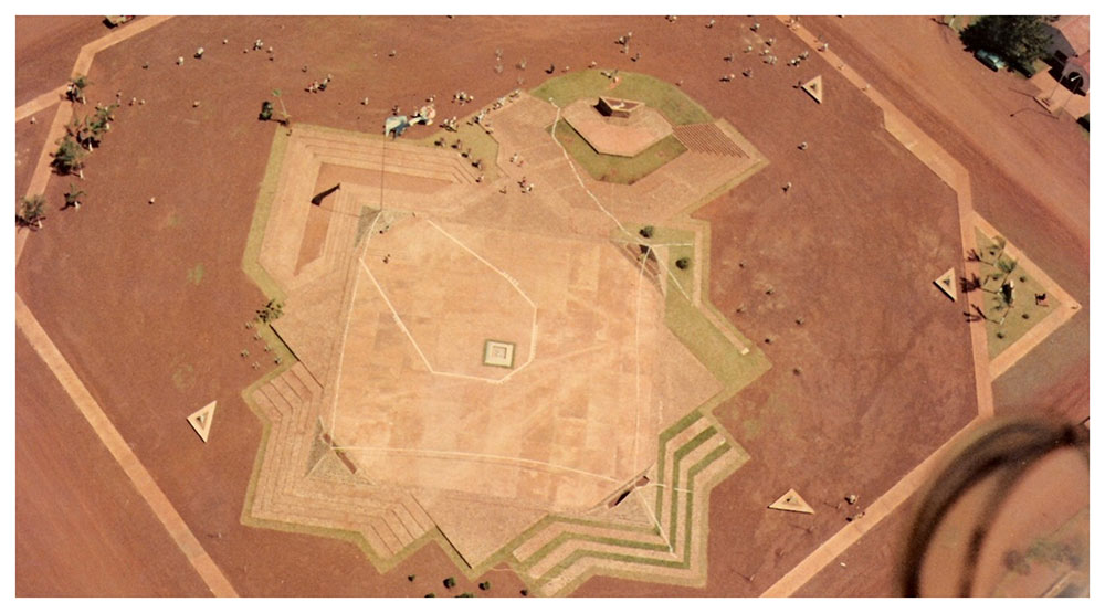Confió que la sugerencia “fue respetar esa geometría y de alguna manera representarla en el cuadrado, que es la plataforma mas importante de la plaza, a través del diseño de dos cuadrados superpuestos concéntricos y girados a 45 grados, de manera que queden como un cuadrado superior, que es la plataforma, y otro con plataformas de la esquina, mas bajos que hace el otro cuadrado en la otra dirección”.