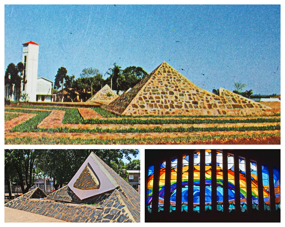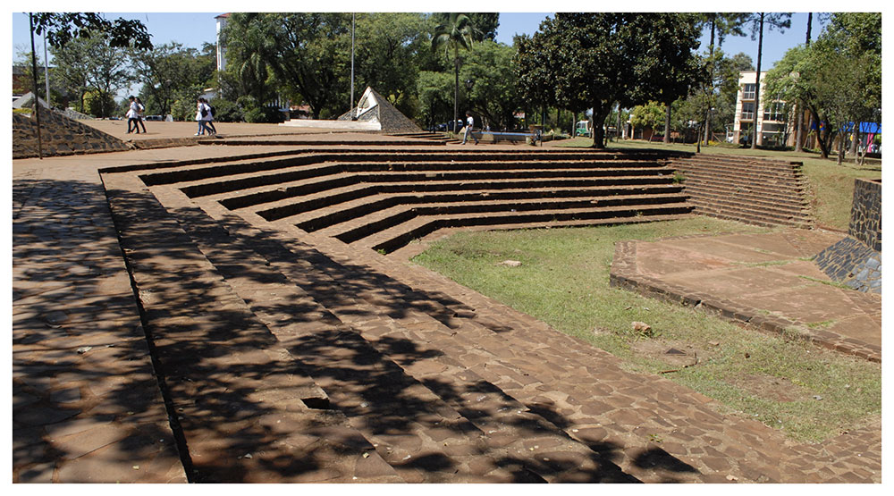 En la primera pirámide que está hacia el Este, existe un poco como el contacto de las dos culturas, la llegada de los europeos a América, en la segunda está la colonización jesuítica, tan arraigada a la historia local, la tercera, una alusión a la independencia, y en la cuarta, una especie de semblanza del futuro que queremos para el país, donde se implanta el mástil de la bandera argentina.