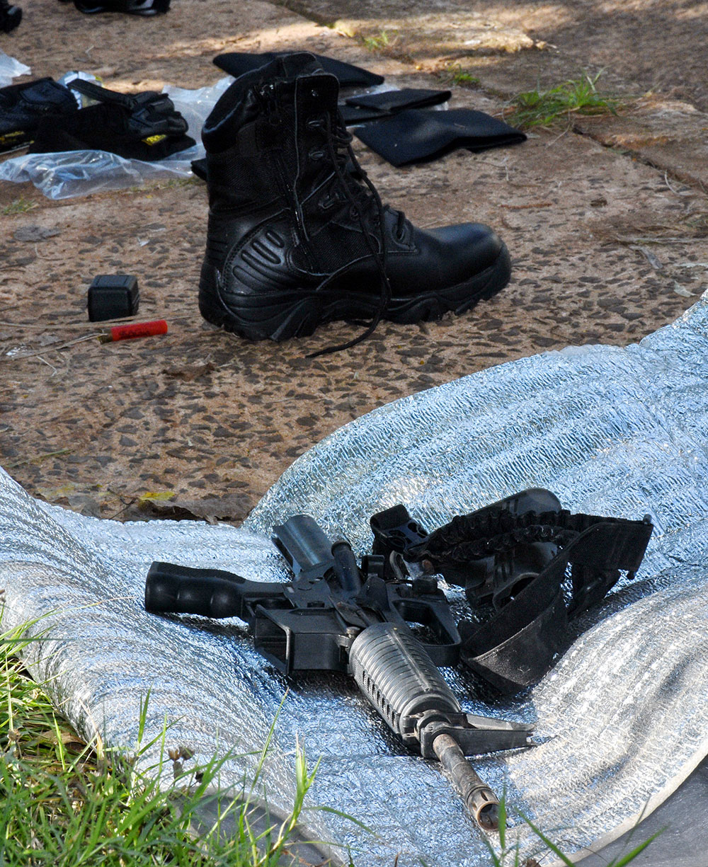 Del inmueble se retiraron todos los elementos que apunten a alguna actividad criminal y se acomodaron en la calle para su arqueo respectivo. Se secuestraron cinco equipos completos para integrantes del Grupo Especial de Operaciones Especiales de la PFA, desde los cascos y chalecos antibala a protectores visuales, rodillas, codos, guantes y las telas con las iniciales de la fuerza de seguridad.