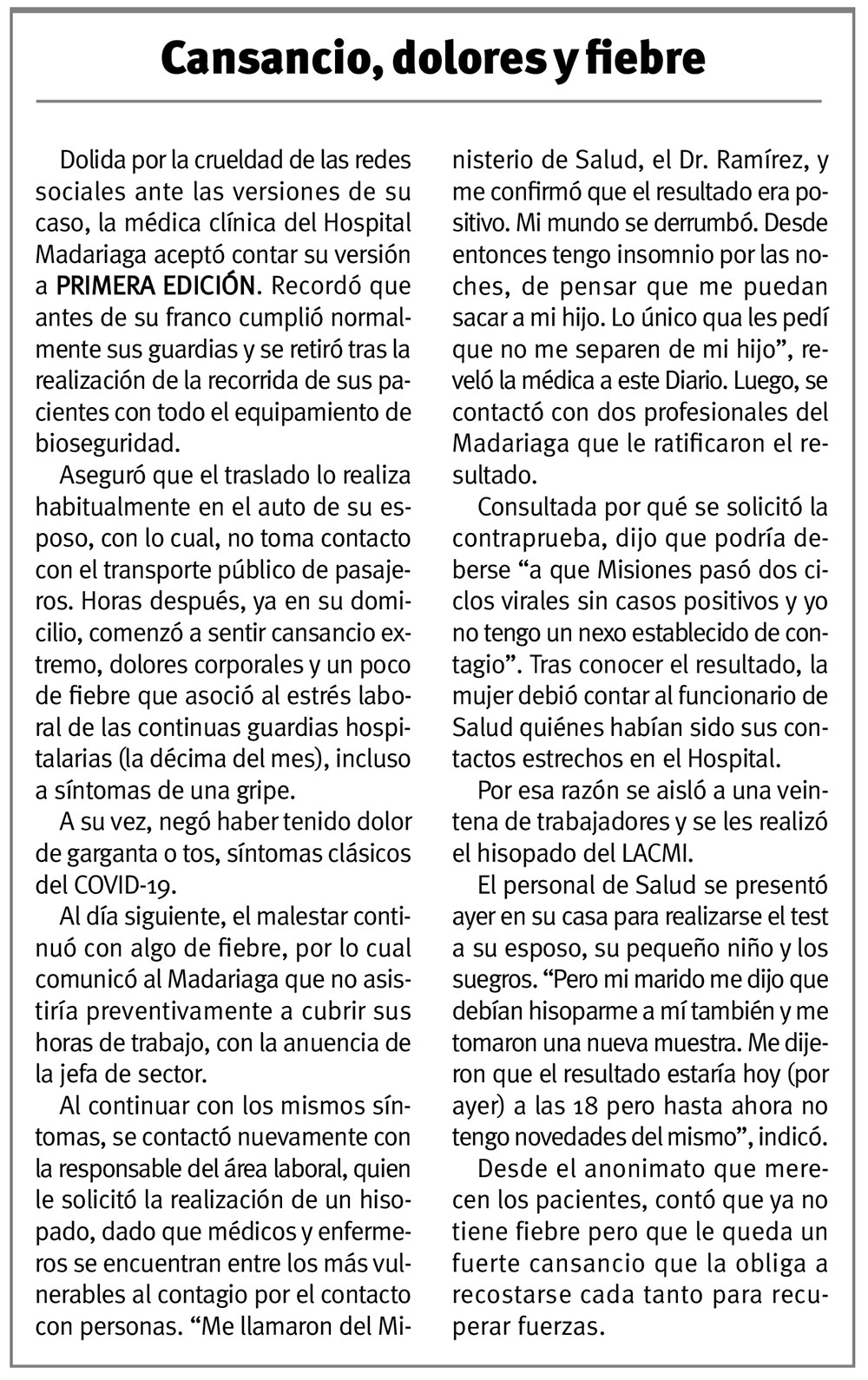 A su vez, la médica confirmó a PRIMERA EDICIÓN que le realizaron un nuevo hisopado, luego de que tres funcionarios de Salud le dijeran que se trataba de un caso positivo sin nexo epidemiológico y sin los síntomas clásicos para la enfermedad.
