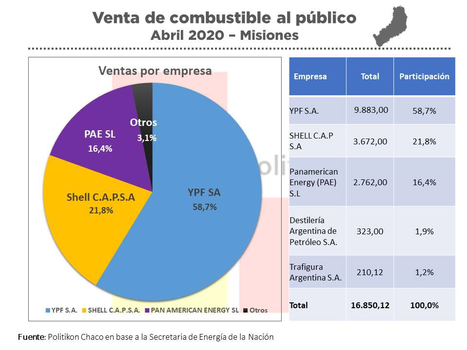 Vista por empresas, la de mayor participación en las ventas en Misiones fue YPF con el 58,7% del total vendido (medido en volumen), que equivale a 9.883 metros cúbicos; le sigue Shell con el 21,8% (3.672 metros cúbicos) y Panamerican Energy, que tiene las estaciones de servicio Axion, con el 16,4% (2.762 metros cúbicos). Otras cuatro empresas se repartieron el 3,1% restante.