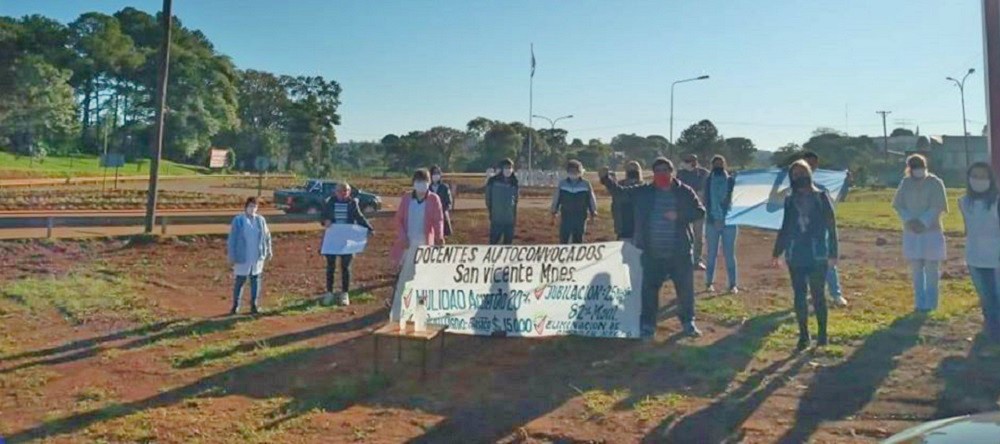 Pese al aislamiento obligatorio por la pandemia de coronavirus, el reclamo de los docentes misioneros por mejores condiciones laborales volvió a tener un nuevo capítulo en la jornada de hoy, en distintos punto de Misiones, incluido en San Vicente, donde se hizo sentir el reclamo de los maestros. Allí, “San Vicente, Docentes Auto-convocados”, retornó en medio del aislamiento por la pandemia, a alzar la voz por un salario digno.