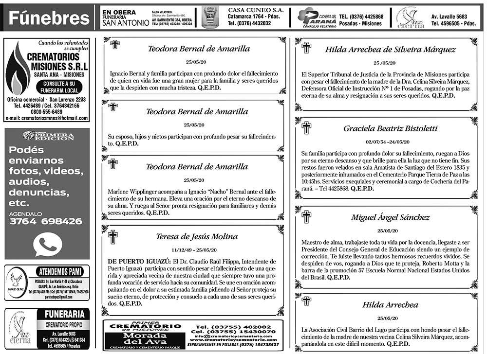 Fúnebres del martes 26 de mayo de 2020