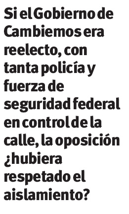 La pregunta que muchos se hicieron en los últimos dos meses es: si el Gobierno de Cambiemos era reelecto, con tanta policía y fuerza de seguridad federal en control de la calle para que se respete la cuarentena, los medios y el periodismo operador (en este caso el Nacional y Popular), los punteros políticos, los dirigentes del kirchnerismo y de la izquierda trotskista, ¿hubieran respetado el aislamiento?