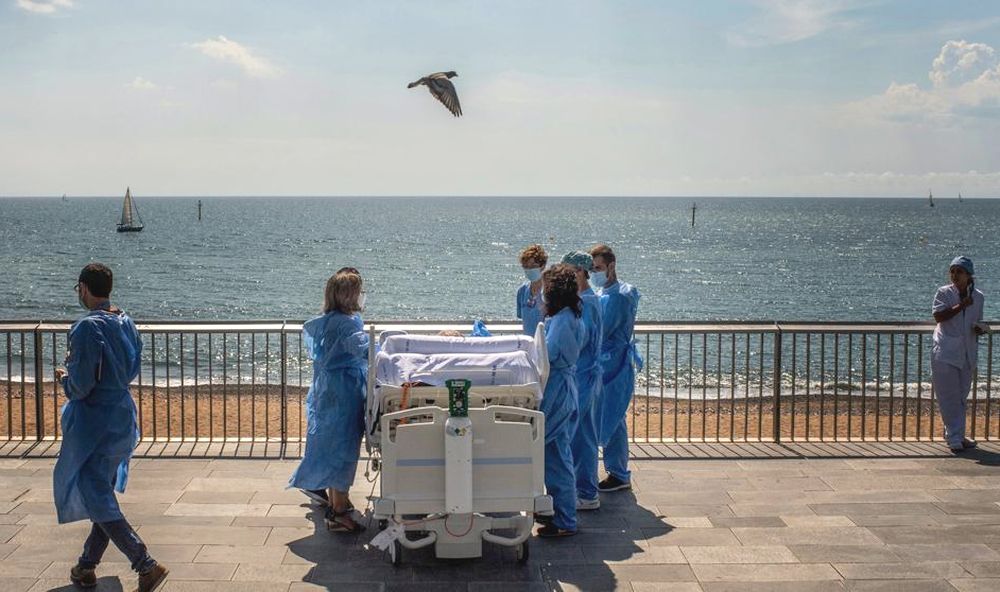 Una cama de UCI frente a la playa del Somorrostro de Barcelona. Es la imagen que retrató este miércoles el fotógrafo David Ramos, y que ha acabado en medios internacionales como The Guardian o la BBC.