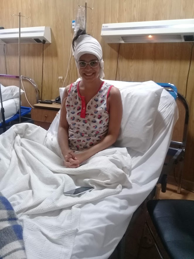 Después de una operación de cinco horas, “salí en coma farmacológico. Estuve unos días en terapia que fue lo más difícil para mí porque estaba sola. Mi cabeza era una usina. No te podés mover porque tenés un montón de cables y la cabeza vendada. Salí a fines de agosto, y en noviembre volvieron a aparecer los síntomas y evaluaron ponerme una válvula que sirve para que fluya el líquido que se comprime en el cerebro”.