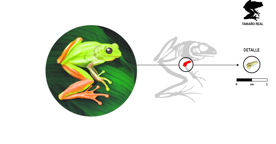 Este pequeño fósil pudo ser identificado gracias a que los anuros, grupo al que pertenecen sapos y ranas, poseen una estructura en forma de pequeña “bolita” en el extremo distal del húmero, en la articulación que forma el codo. Esta estructura esférica les brinda a estas especies gran agilidad a la hora de realizar movimientos rápidos y parecería ser una adaptación para realizar el salto.