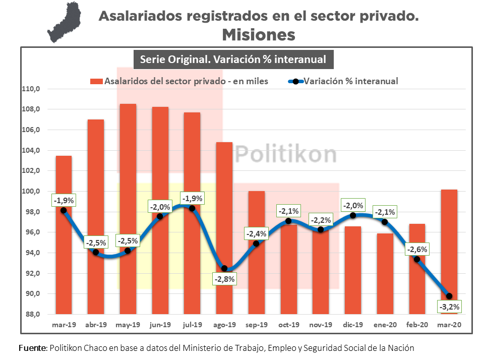 En el mes de marzo de este año, la cantidad de trabajadores registrados del sector privado cayó un 3,2% en Misiones, comparado con el mismo mes del año anterior, lo cual equivale a una pérdida de 3.330 puestos de trabajo medidos de forma interanual. De esa manera, junto a Formosa, alcanzó la caída más grande del NEA.