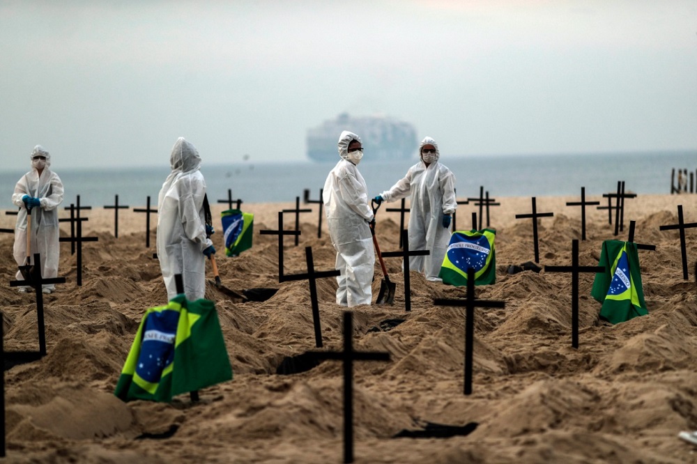 Activistas brasileños cavaron hoy un centenar de tumbas en la playa de Copacabana, uno de los principales puntos turístico de Río de Janeiro, en una acción de protesta contra la política oficial del gobierno de Jair Bolsonaro frente a la pandemia de coronavirus, en el país en el que se espera que hoy los muertos por Covid-19 superen los 40.000.