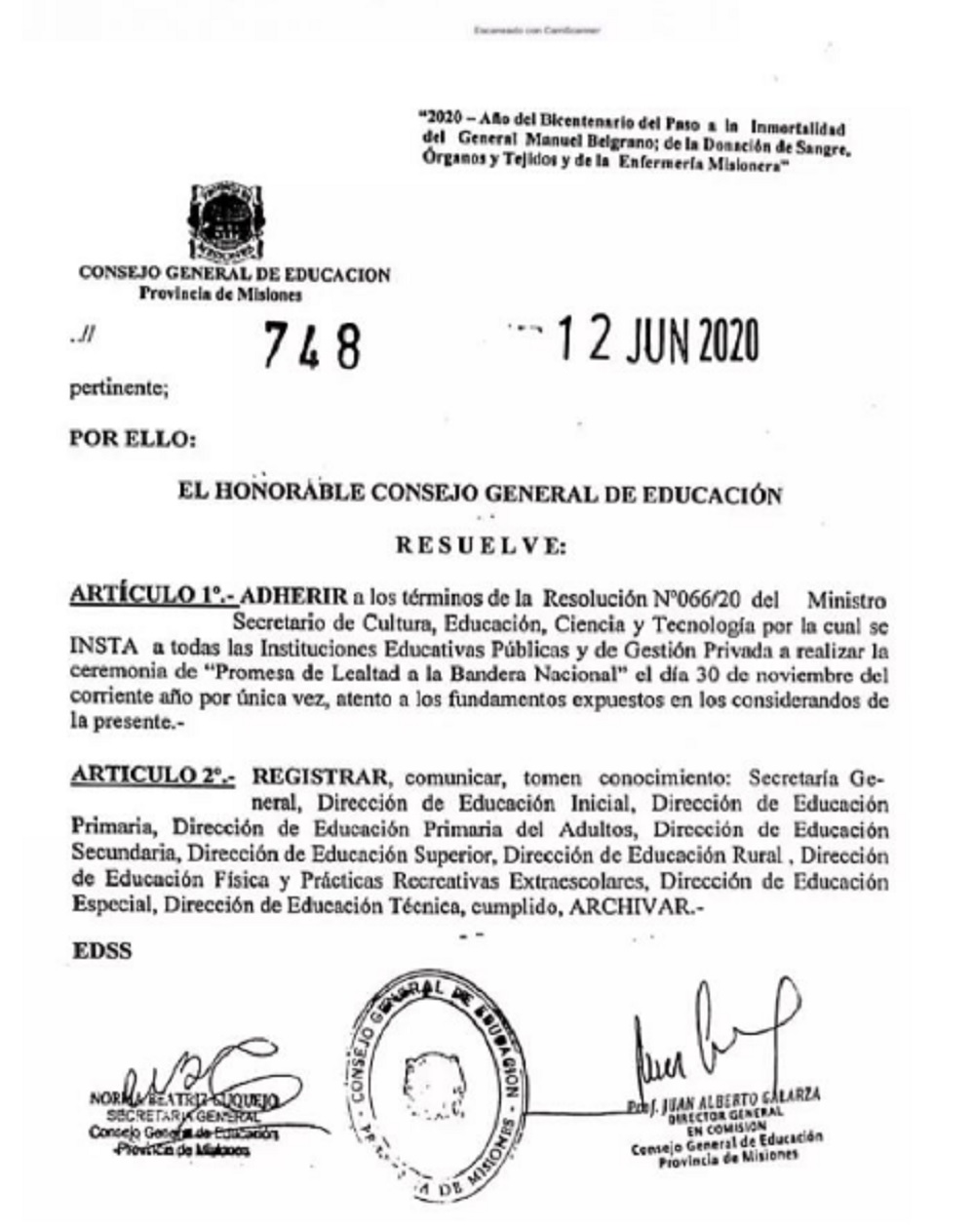 Debido al contexto excepcional de pandemia, el CGE publicó este viernes la Resolución 748 donde se establece que “todas las instituciones educativas públicas y de gestión privada realizarán la ceremonia de Promesa de Lealtad a la Bandera  el 30 de noviembre del corriente año por única vez”.