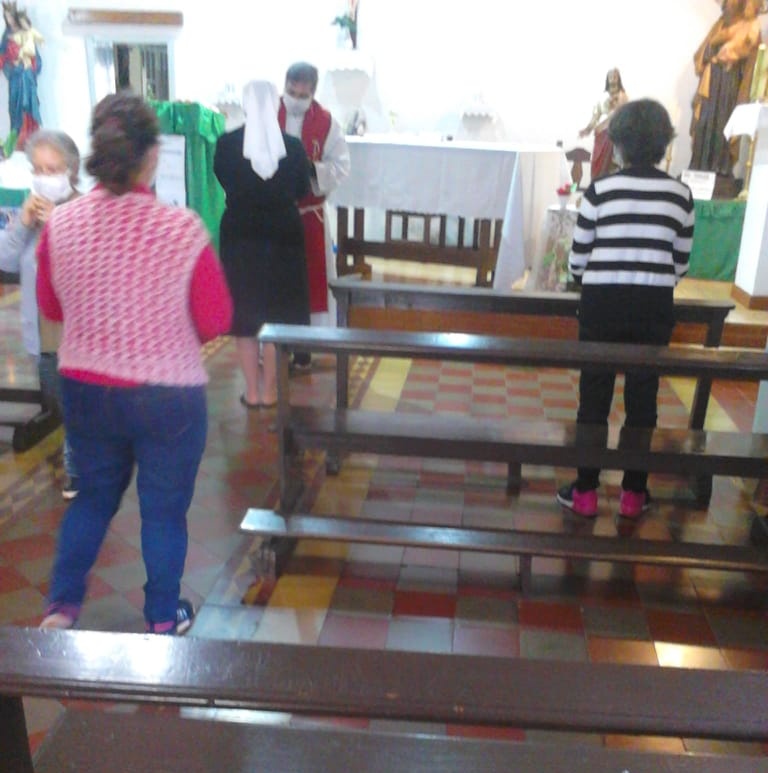 Todo esto siempre manteniendo las estrictas medidas de higiene, la limpieza de los zapatos en la alfombra con lavandina colocada en la puerta, el alcohol en gel que también está en la entrada, y por supuesto los barbijos, contó el sacerdote.